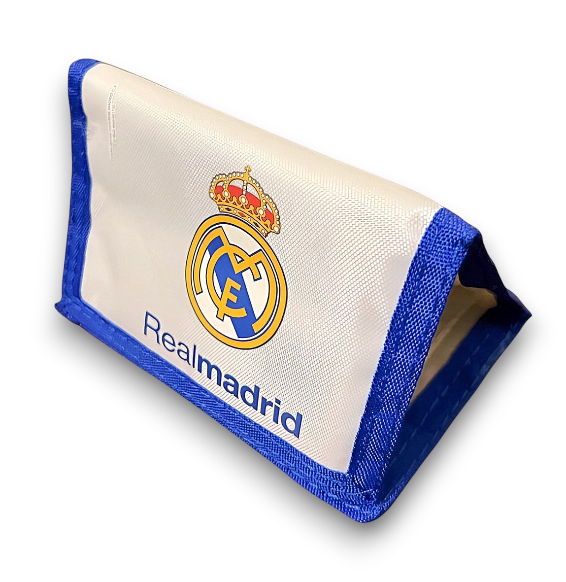 A Real Madrid Wallet, made of nylon and is tri-fold and has a coin zipper and larger pocket for paper money, in addition to a slot for cards. The wallet is official licensed Real Madrid Merchandise. The wallet's measurements are 9.8"X 9.8"X 19.5" / 25 x 25 x 50 x cm